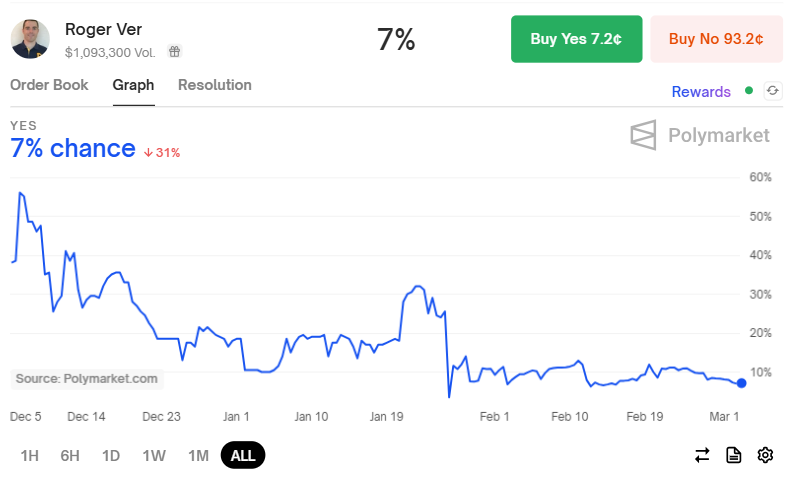 Despite these efforts, predictions market odds on Polymarket show only a 7% chance that Trump will pardon Ver within his first 100 days in office.