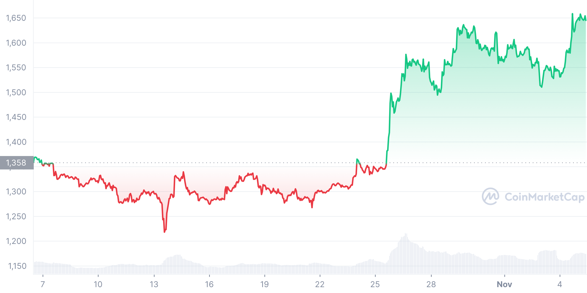 SponsoredETH has outperformed BTC’s price performance over the last 24 hours and on the 30-day metric. According to CoinMarketCap data, Ethereum rose 4.8% in the last 24 hours and by 22.3% in the last 30 days. It is now trading at $1,652 as of press time.