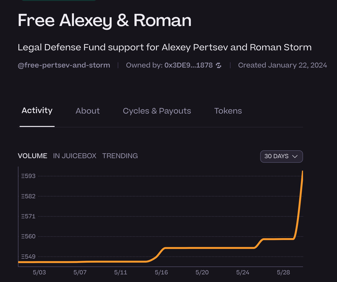 Etherscan data reveals that Buterin donated to the “Free Pertsev and Storm” defense fund on the decentralized fundraising platform Juicebox on May 30. As of this writing, the fund has accumulated 591 ETH, equivalent to $2.2 million, to support the developers’ legal battles.