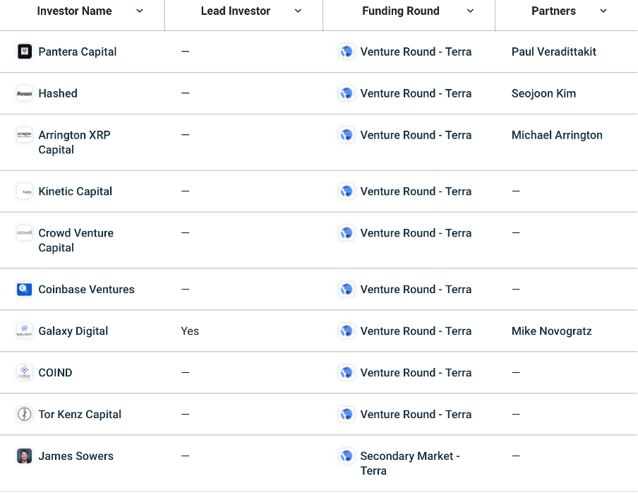 CrunchBase data shows 29 investors funded Terra. Some of the main ones were: