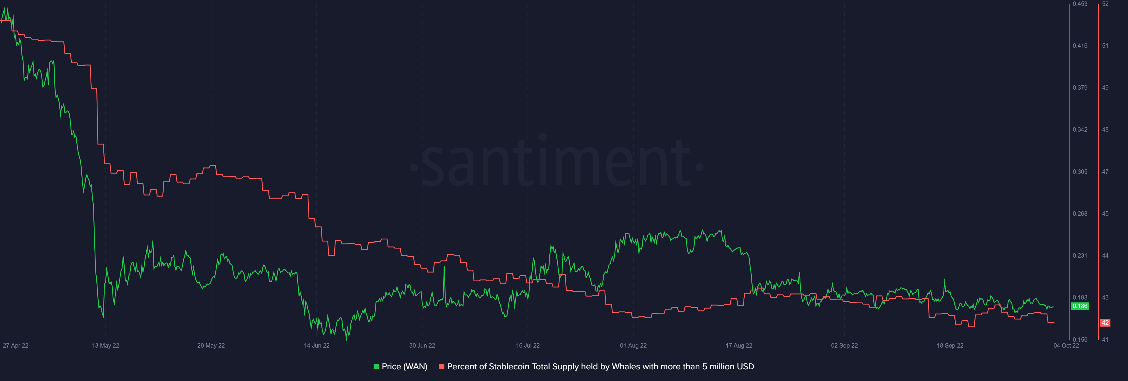 Notably, WAN’s percentage of stablecoin total supply held by whales with more than $5 million also presented a deviation from price.