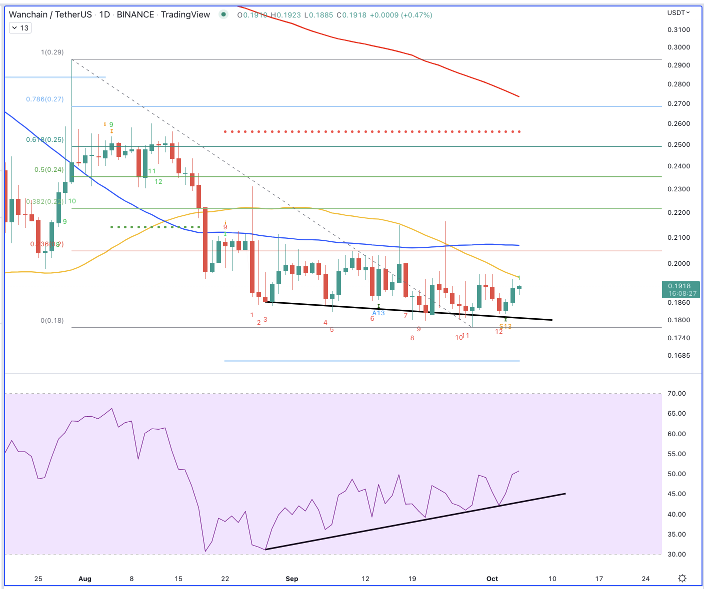 From a technical perspective, WAN price appears to be forming a bullish divergence against the RSI on the daily chart. The next significant resistance level for WAN sits at $0.2. Once bulls are able to push the price above this key resistance the next crucial resistance for WAN would be at $0.23.