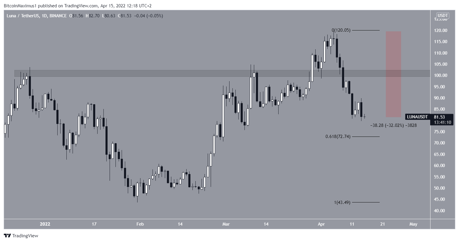 LUNA is approaching the main support area at $72.75. This is the 0.618 Fib retracement support level.