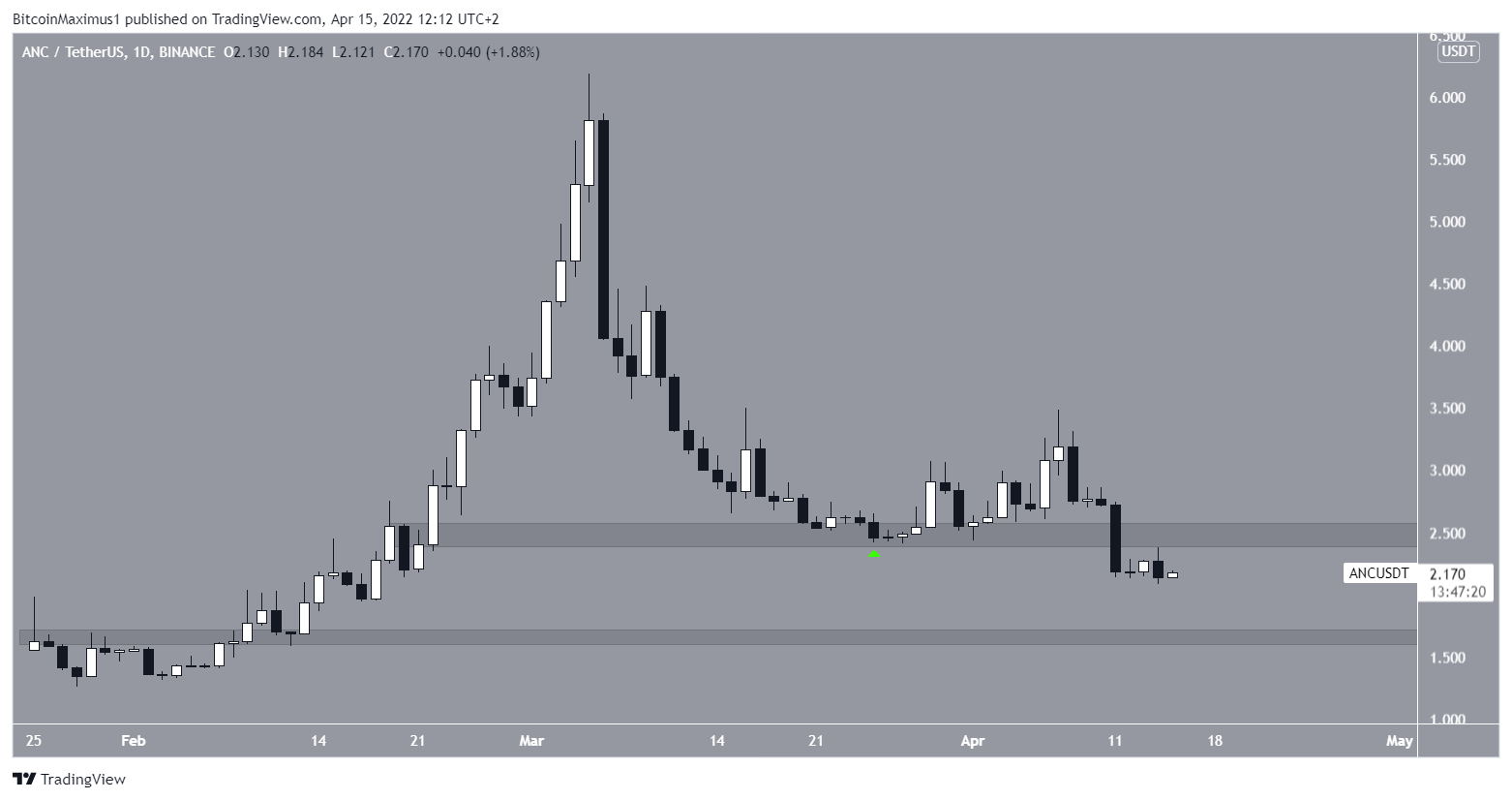 Initially, ANC bounced at the $2.50 horizontal area on March 25 (green icon). However, it broke down below it on April 11.
