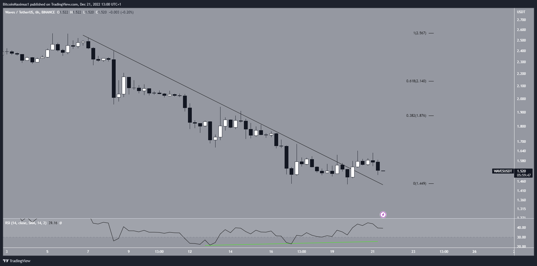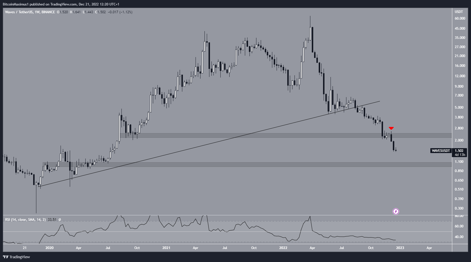 The WAVES price has fallen since reaching an all-time high price $63.88. The downward movement led to a low of $1.44 on Dec. 21.
