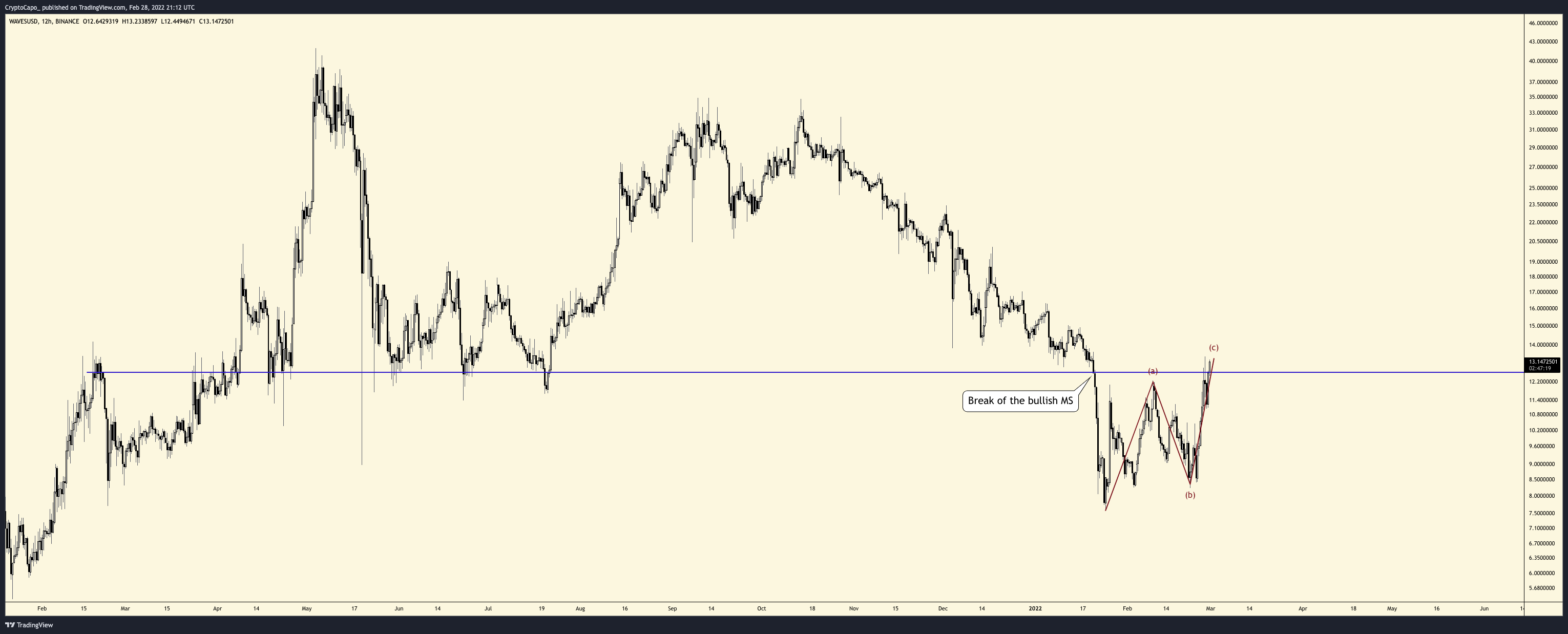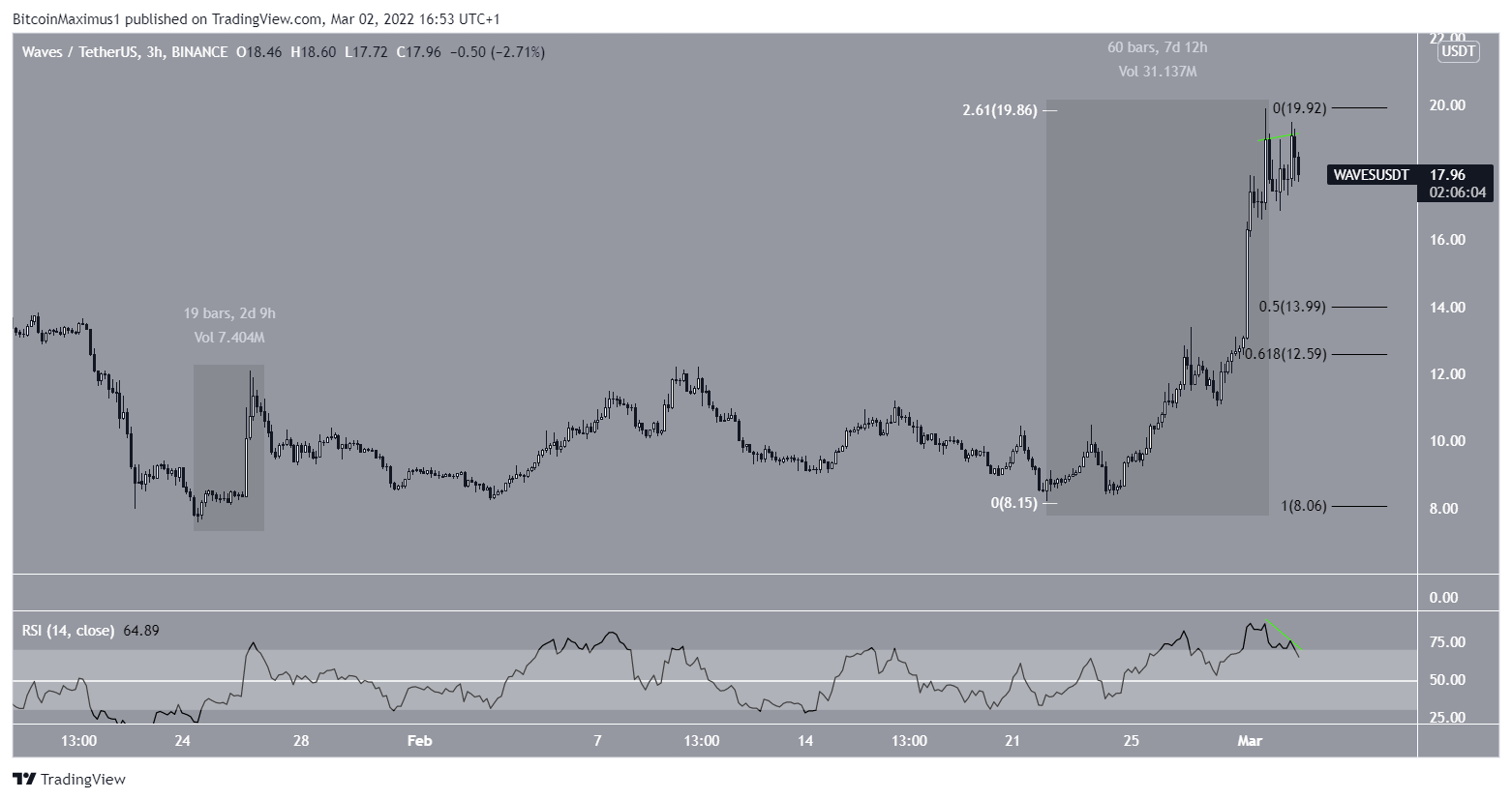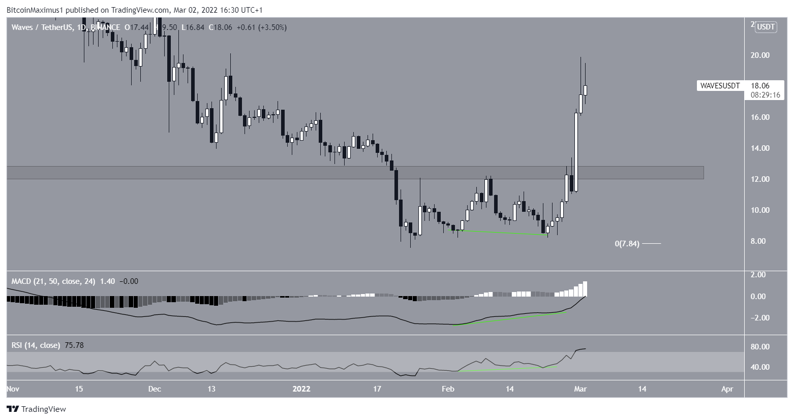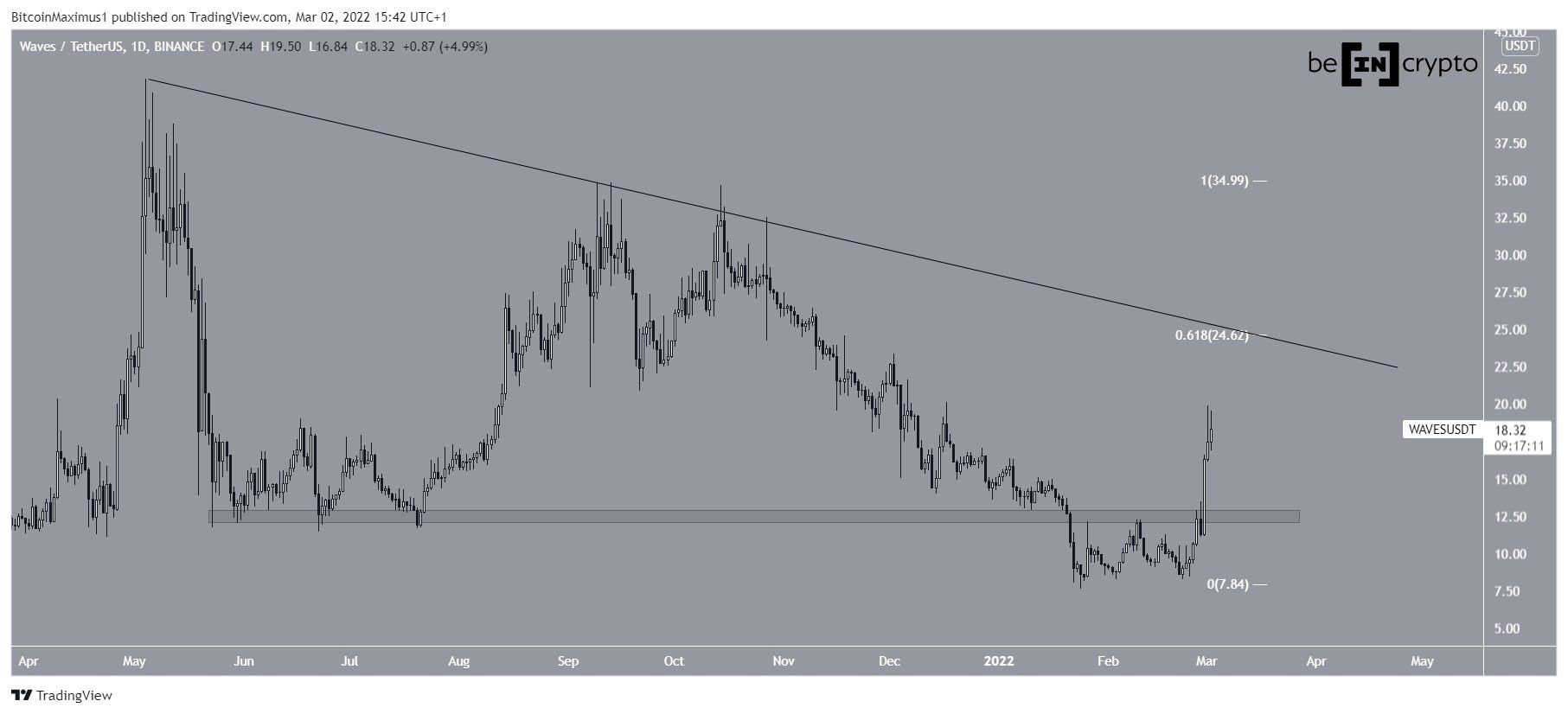 WAVES has been decreasing alongside a descending resistance line since reaching an all-time high price of $41.86 on May 4. The decrease led to a low of $7.56 on Jan 24.