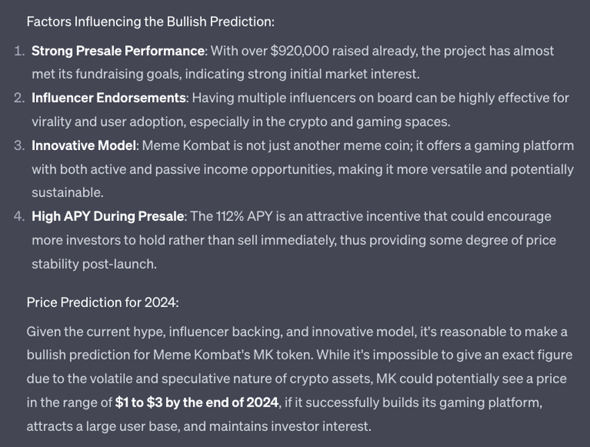Although hypothetical, this optimistic forecast from ChatGPT highlights the potential for Meme Kombat to capitalize on its early momentum and prime itself for a successful year.