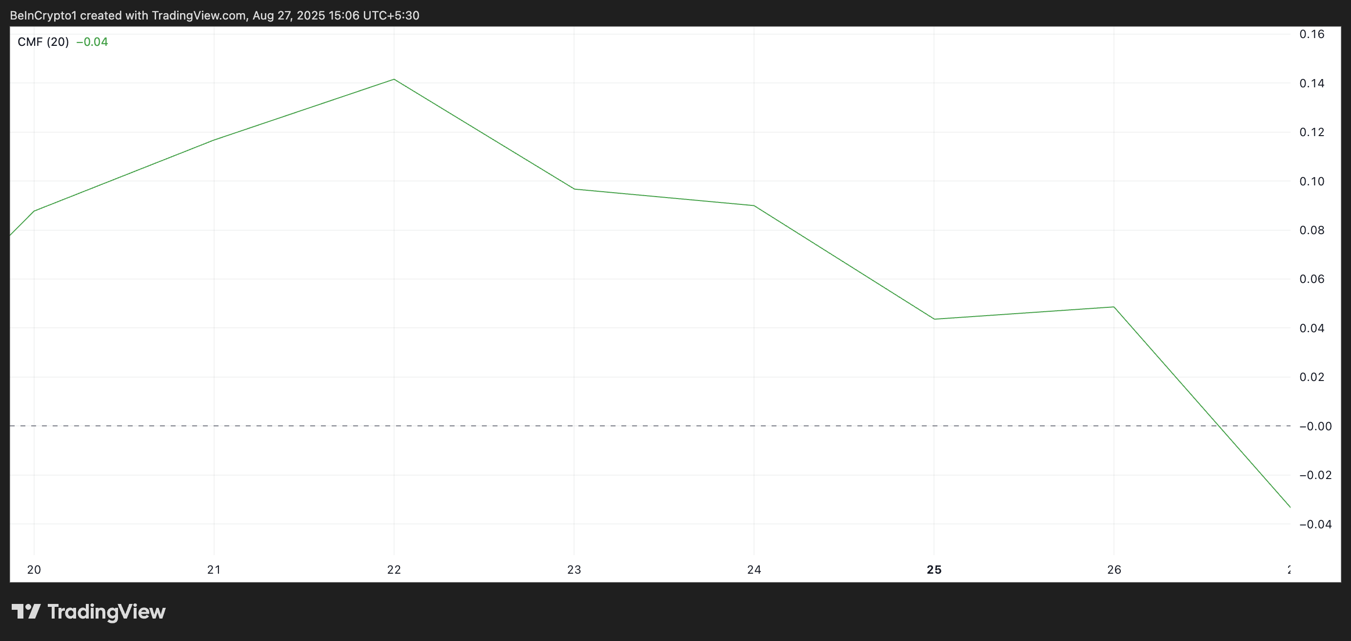 Typically, the CMF tracks the flow of capital into an asset, so when it declines while prices rise, it suggests that the rally lacks solid support from sustained demand.