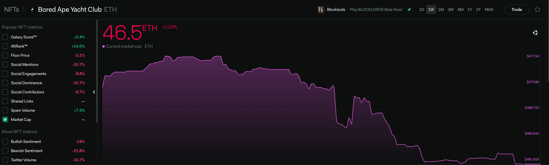 BAYC’s market cap continued its almost two-month downward trajectory to 461,910 ETH.