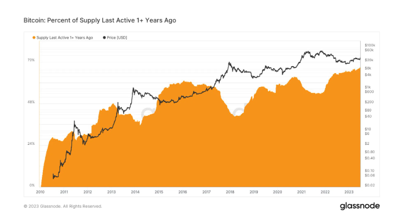 The amount of Bitcoin (BTC) sitting dormant is on the rise, despite hitting a new 2023 high this week. Every day, new record highs are being set in the amount of Bitcoin supply that has not moved in at least a year.