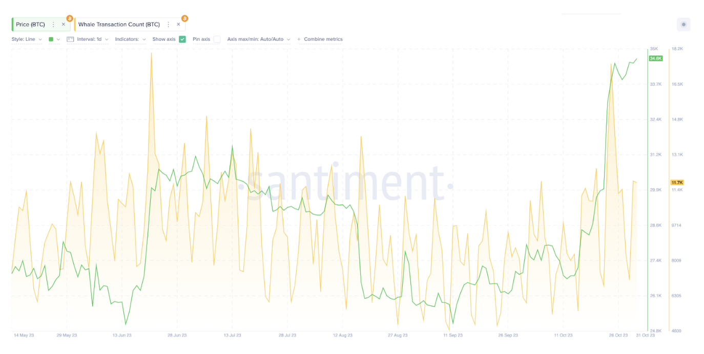 Before the FOMC announcement, BeInCrypto’s on-chain analyst Ibrahim Ajibade said on-chain activity showed crypto investors had already penciled in a rate pause. Between Oct. 22 and Nov 1, Bitcoin attracted 7,000 daily transactions by large crypto holders, called whales.
