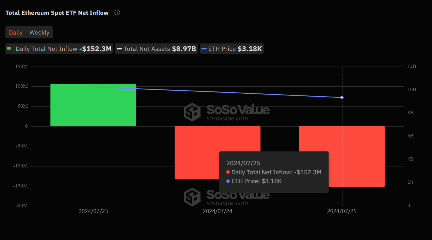Despite positive inflows for the new ETFs, the Grayscale Ethereum Trust (ETHE) experienced substantial outflows of $484.1 million. As of July 25, these ETFs had a negative cumulative net flow of $178.68 million, primarily due to ETHE’s outflows.