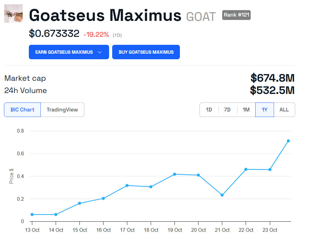 Despite initial suspicions of human control after a spelling error, Ayrey and Marc Andreessen’s endorsement, along with Binance’s decision to list GOAT, drove the token’s price to a new high above $0.7. However, in the past 24 hours, the GOAT token has retraced by nearly 20%, currently trading at $0.67