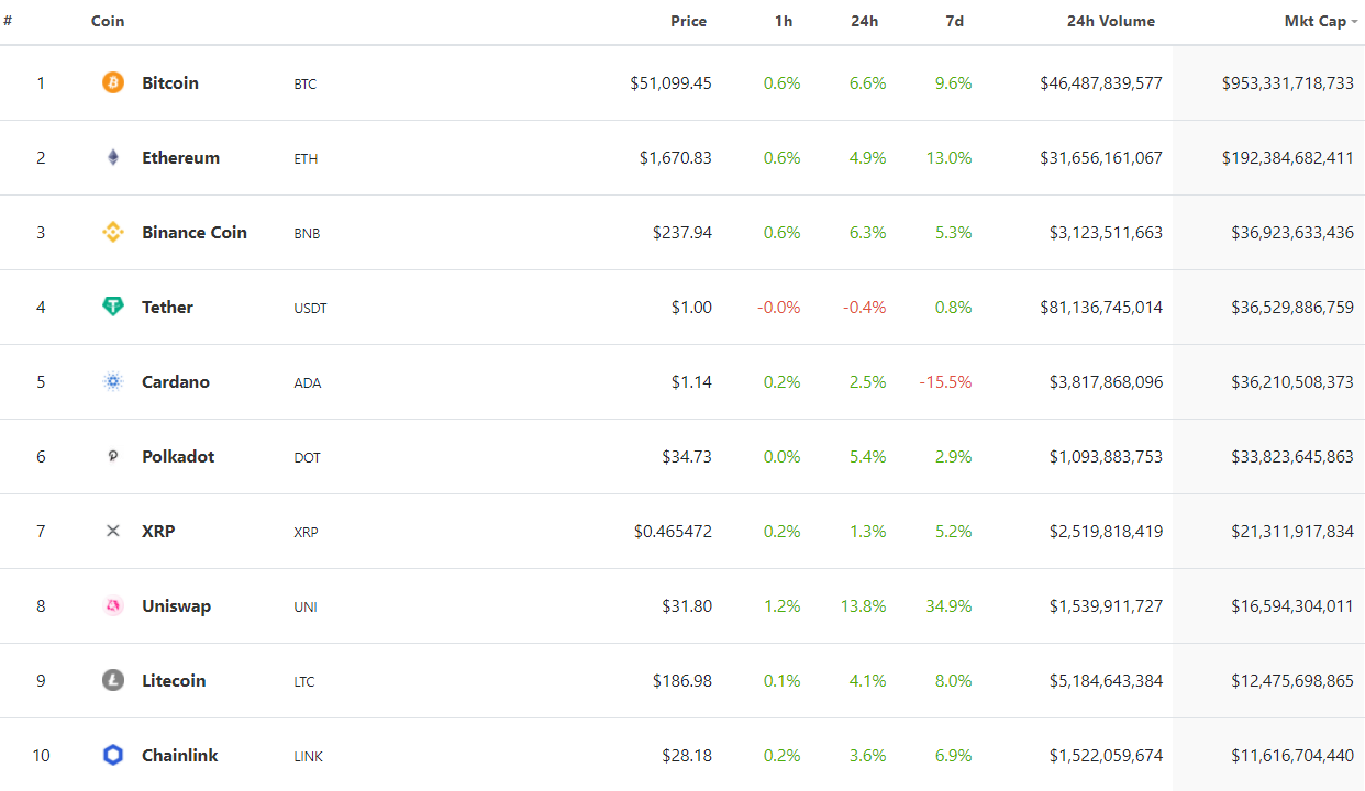 This weekend roundup sees Bitcoin gaining on Sunday and breaking $51,000 as Saturday’s dismal performance was overcome late on the weekend. Ethereum and all major altcoins also saw green on Sunday.