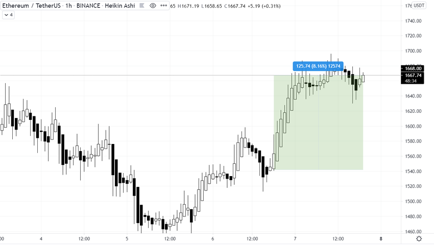 Ethereum also had a fairly good weekend as the crypto climbed over 8% on Sunday to reclaim $1,600 and push towards the $1,700 mark.