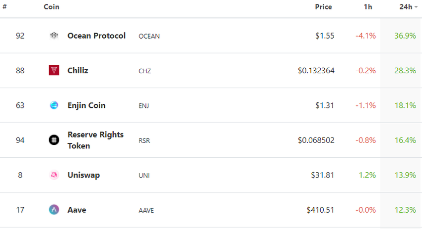 Honorable mentions include Chiliz which recently announced a $50 million expansion plan. Uniswap also featured in the top 5 biggest gainers within the top 100.