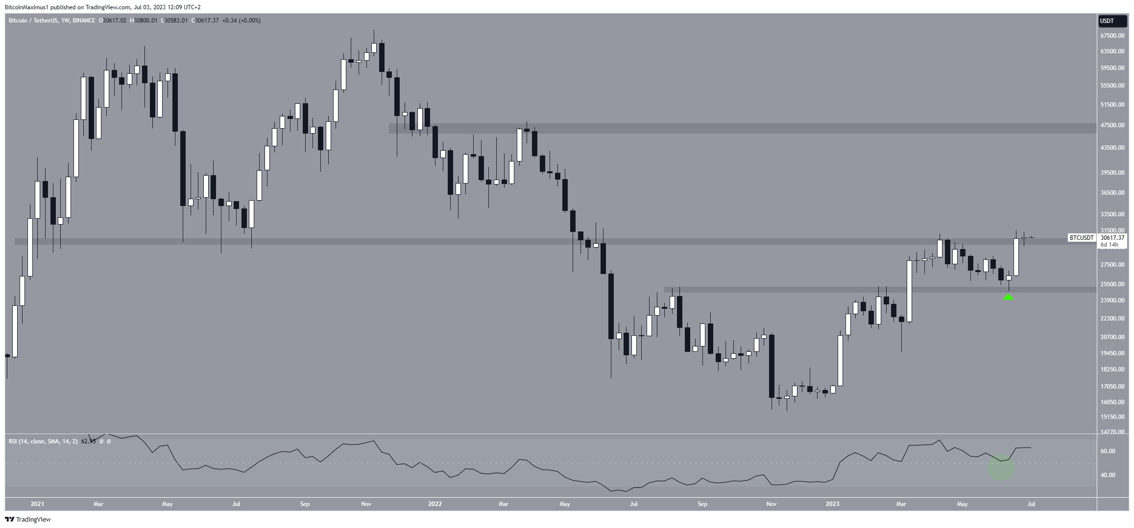 According to the technical analysis on a weekly time frame, the price of BTC has reached a significant resistance level of $30,000. This level has played a crucial role for Bitcoin throughout the years, acting as both support and resistance at different times since January 2021.