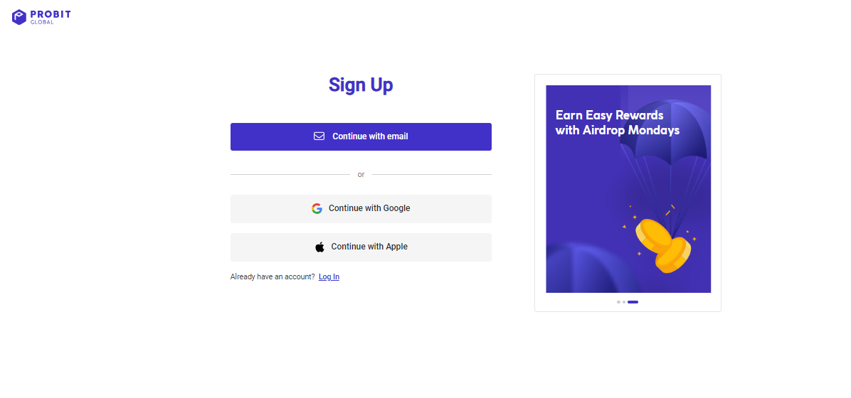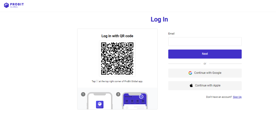 To purchase the WESP token, you need an account with Probit Exchange. You can create an account with your email address or sign up directly with your Google or Apple account.