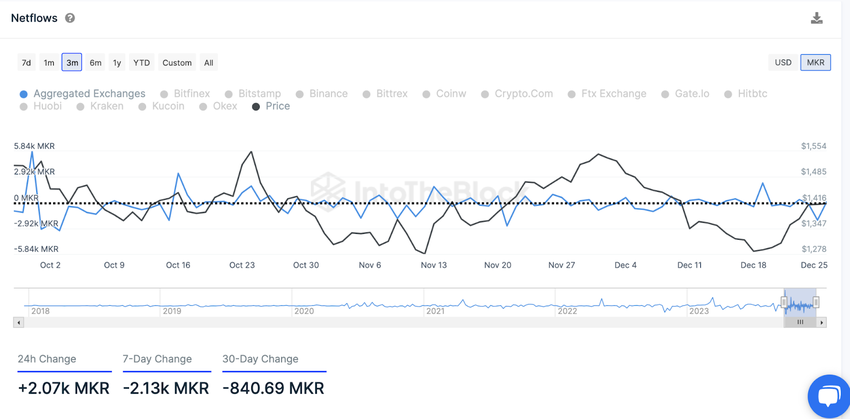 Based on the seven-day timeframe, the screenshot below shows that the MKR balance on centralized exchanges has decreased by 2130 tokens. However, in the past 24 hours, the balance on the centralized exchanges increased by over 2,000 tokens.