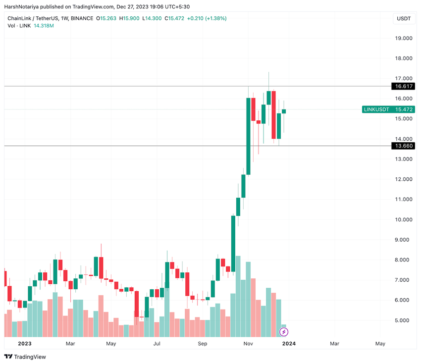 Chainlink (LINK) was one of the first movers during the bull rally that started in October 2023. However, for over a month, the price of LINK has been roughly consolidating between $13.6 to $16.6.Â