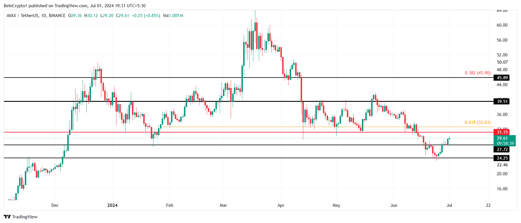 Avalanche’s price trading at $29.61 is closing in on the critical resistance level at $31.15. This price has tested as a crucial support level multiple times in the past and flipping it into support again is the target.