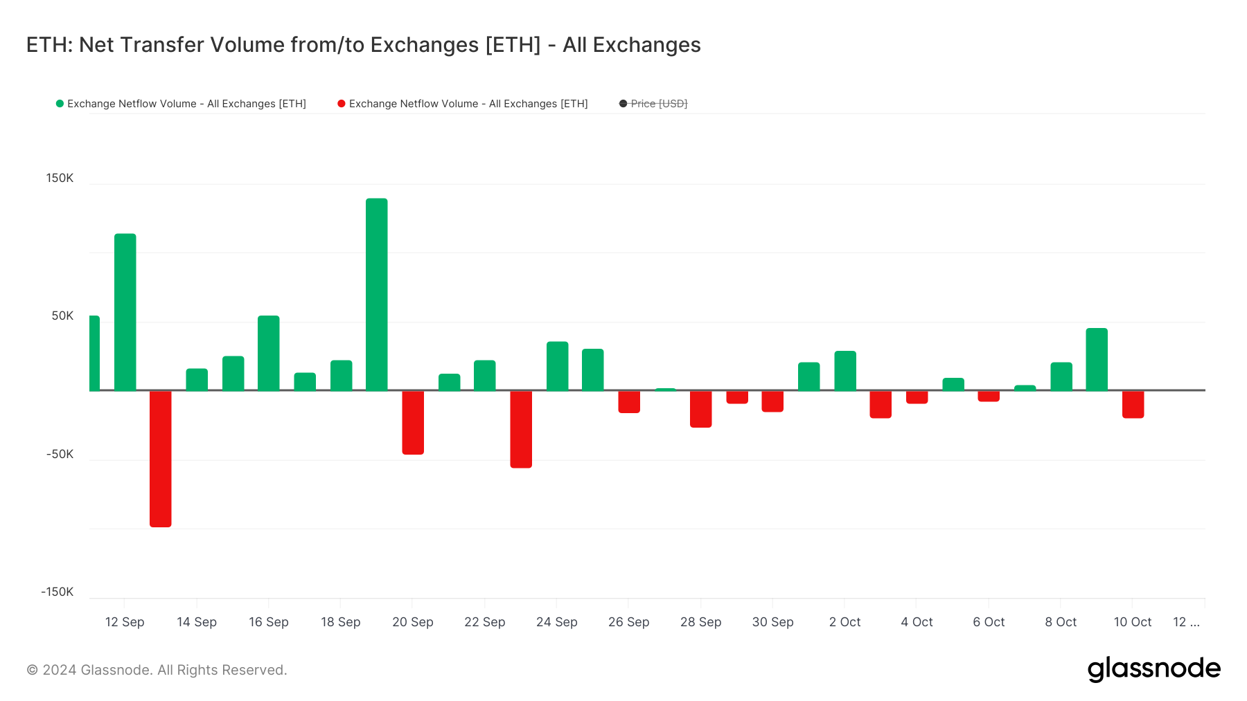 The net transfer volume of Ethereum to and from exchanges over the past month reflects a market struggling to find a clear direction. During this period, netflow reached a monthly high of 140,000 ETH on September 19, indicating a substantial inflow of ETH into exchanges.