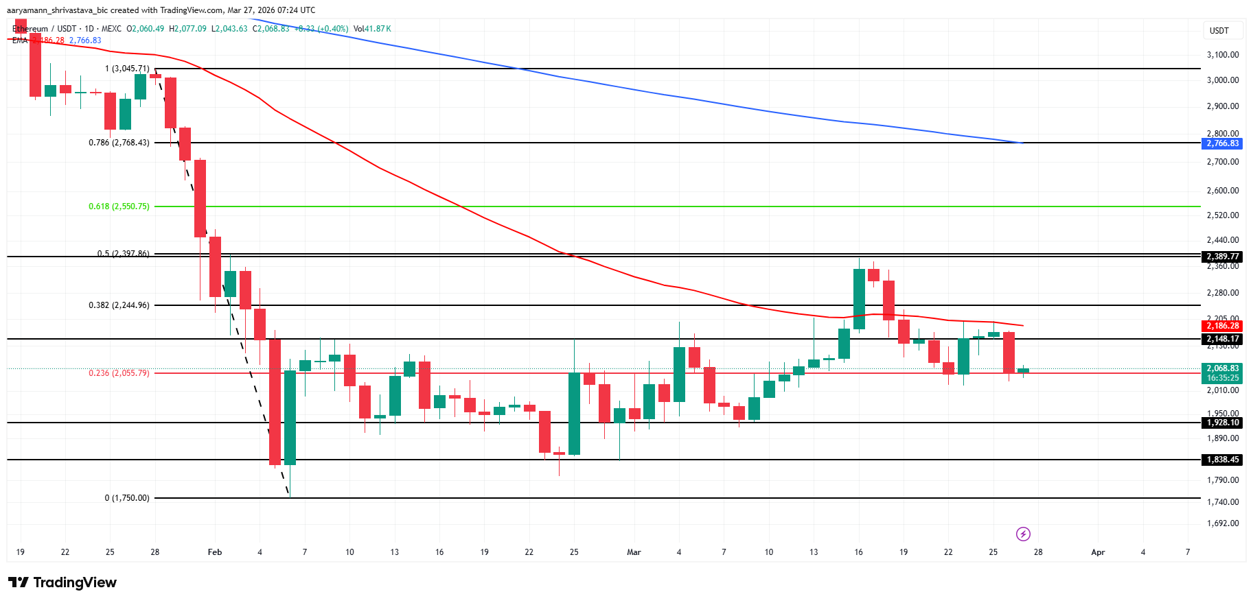 The 0.236 level at $2,055 has been the battleground since early March. Every session that has tested it has either closed above or produced a recovery. Ethereum price is currently pressing it again, and the outcome of this test determines the next destination. Below $2,055, the $1,928 horizontal support is the next level on the chart and represents the last defense before the $1,838 floor comes into play.