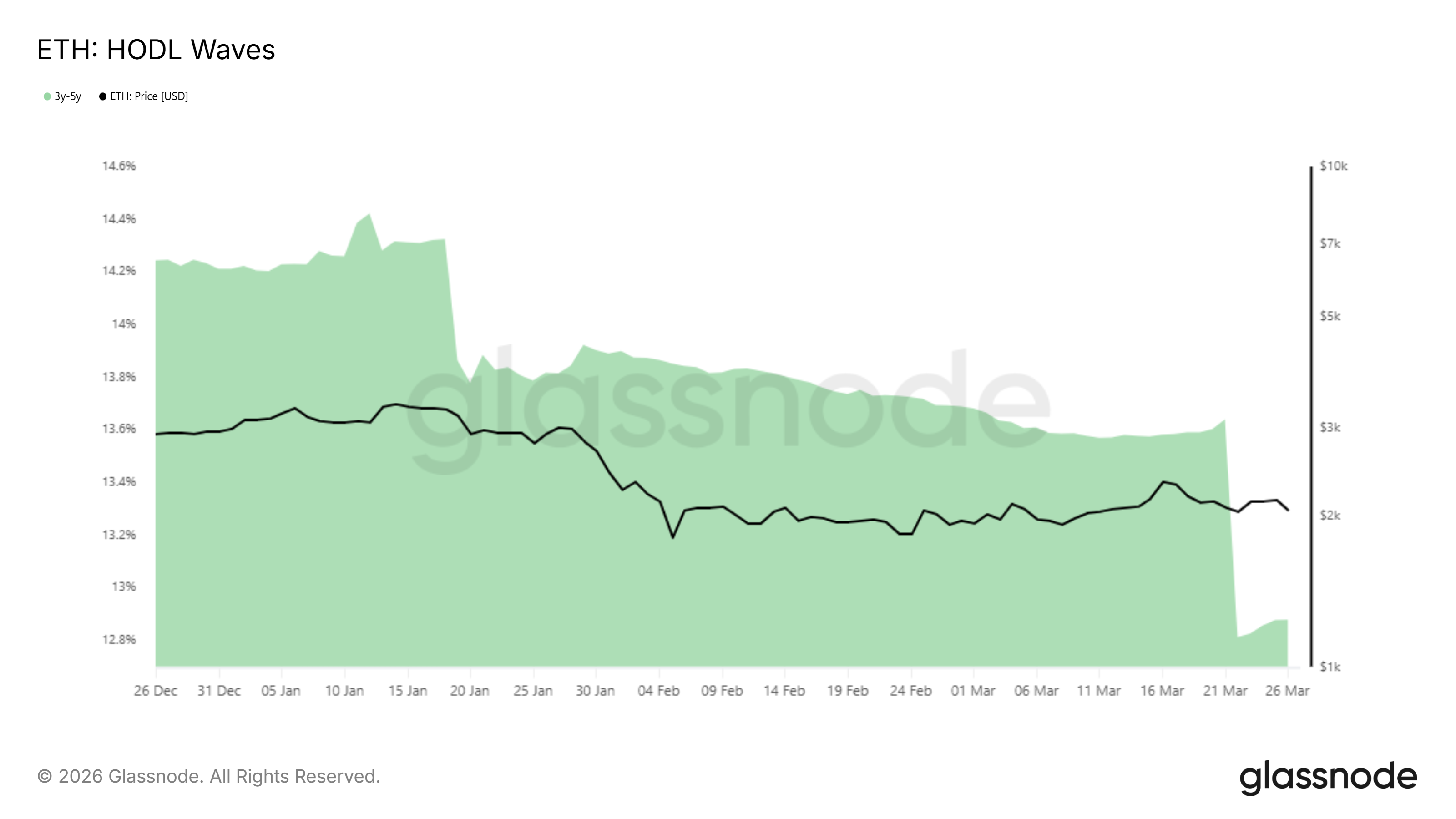 The Glassnode HODL Waves chart tracking the 3-to-5 year holding cohort spans December 26, 2025, through March 26, 2026. That band held relatively stable between 14.2% and 14.4% of total ETH supply from late December through January 20 before beginning a gradual decline.