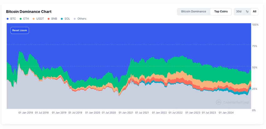 Changes in the market share of BTC from 2018 to the present. At the beginning of the interest rate cut cycle, the market share of BTC gradually increased. In contrast, in the later stage of the interest rate cut cycle, the market share of BTC gradually decreased. Source: Coinmarketcap