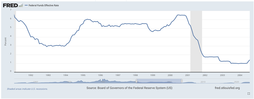 Changes in the Fed funds effective rate in the 1990s. Source: St. Louis Fed