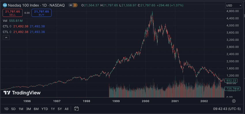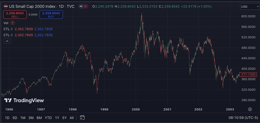 The Russell 2000 and Nasdaq indices movement before and after the “Dot-com Bubble”. Source: Tradingview