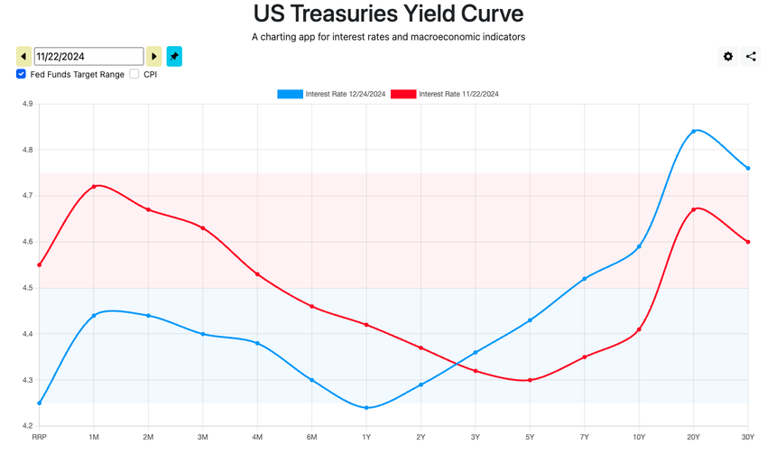 US Treasury yield curve changes. Since the end of November, the 10-year Treasury yield has risen by nearly 20 bps, close to 4.6%. Source: ustreasuryyieldcurve.com