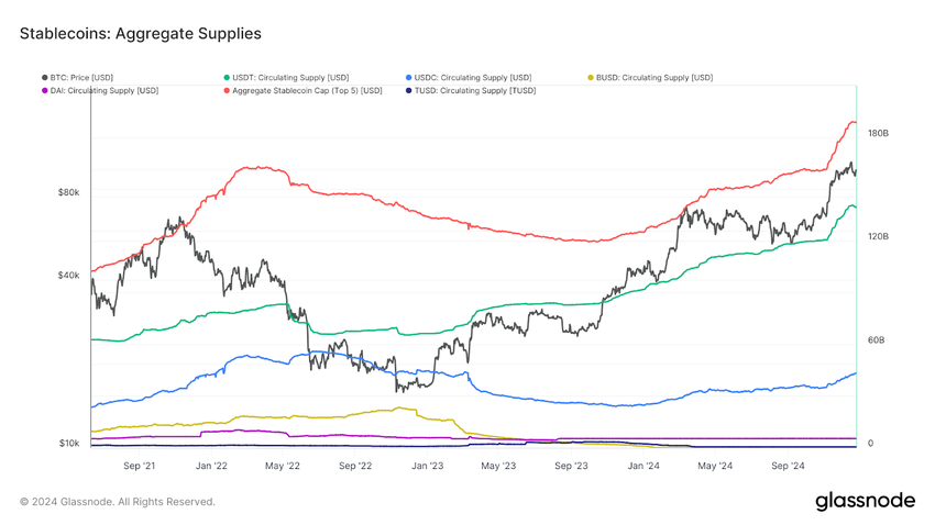 The aggregate supply scale of stablecoins. Stablecoins are usually regarded as a source of cash liquidity within the crypto market. Source: Glassnode