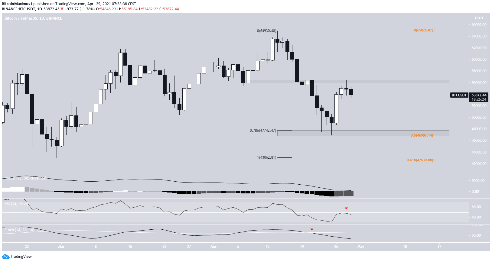 BTC has been increasing since bouncing on April 26. The bounce began at a strong support level between $46,900-$47,725. The support is created by the 0.5 long-term Fib (orange) and 0.786 short-term Fib (black) retracement levels.