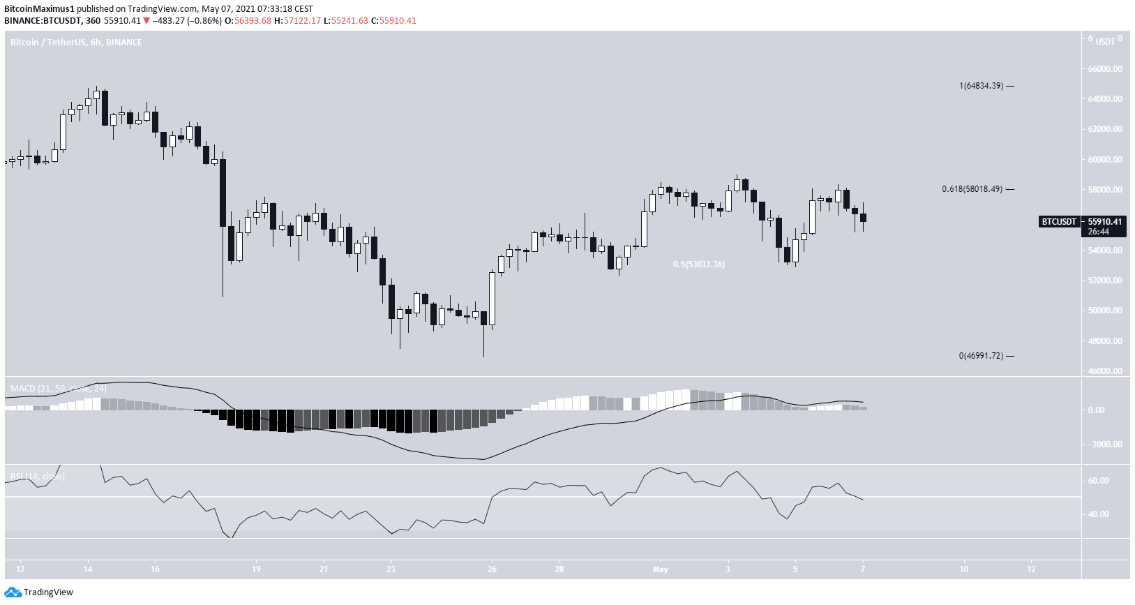 BTC has been moving upwards since bouncing at the $53,000 support area on May 5. The support area is created by the 0.5 Fib retracement level of the most recent upward movement (white).