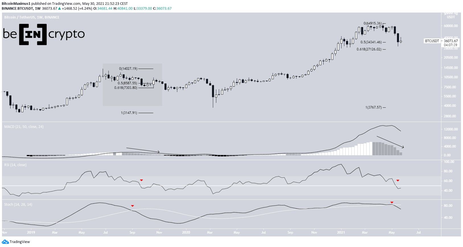 Last week, BTC stymied its downward trend. It created a small bullish candlestick with a bullish close. The bounce occurred right at the 0.5 Fib retracement support level at $34,350.