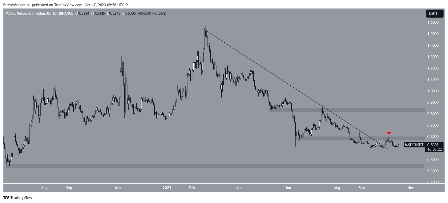 Even though the MATIC price moved above the trendline, it did not reclaim the $0.60 horizontal area. Rather, it was rejected by it on October 5 (red icon) and began to decline, falling to its pre-breakout levels.