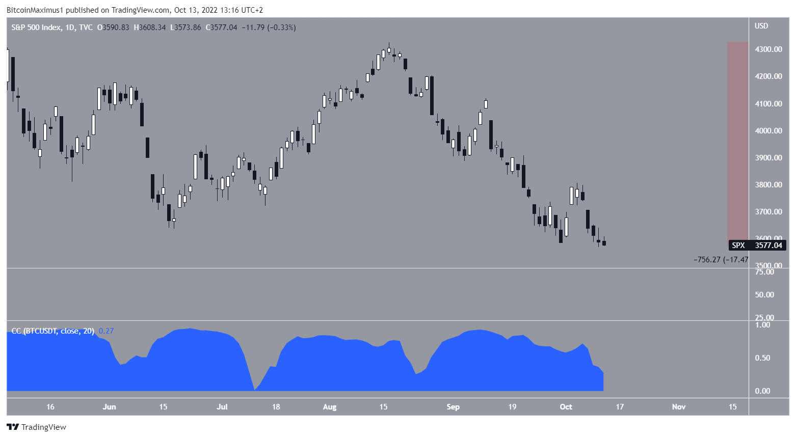 SponsoredDue to the nearly perfect correlation (blue) between SPX and the crypto market, a fall in the former inversely correlates with the other.