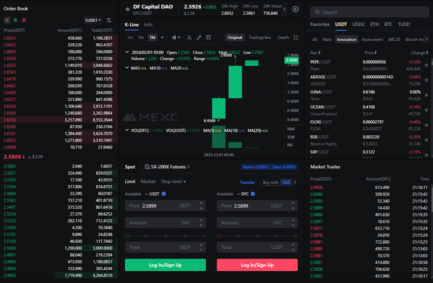 One of the easiest ways to buy DFC tokens is through the help of the MEXC exchange. Opening an account takes about roughly 5 minutes. Once the account is up and running, deposit a stable USDT coin and make a transaction on the spot.
