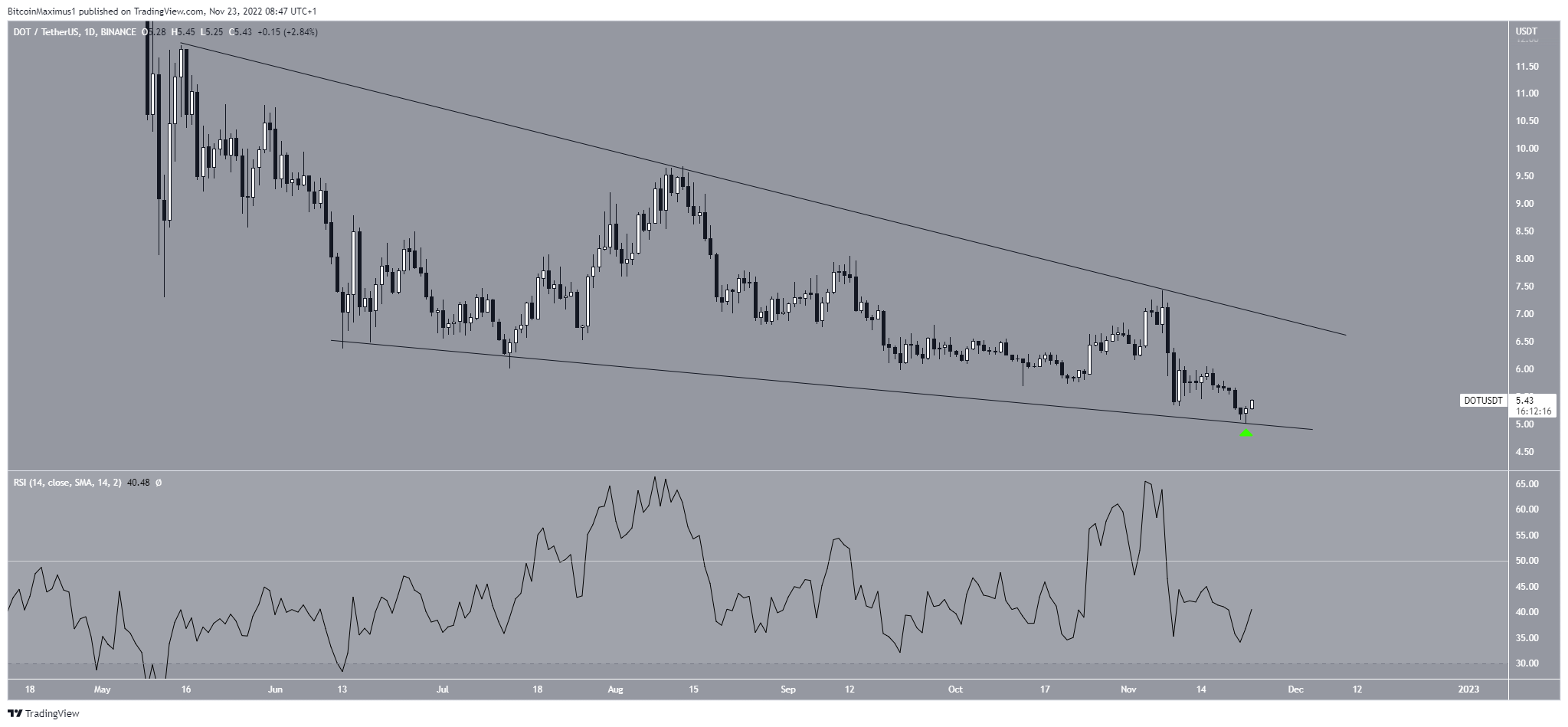 The price chart from the daily time frame shows that the DOT price has been trading inside a short-term descending wedge since the beginning of May.