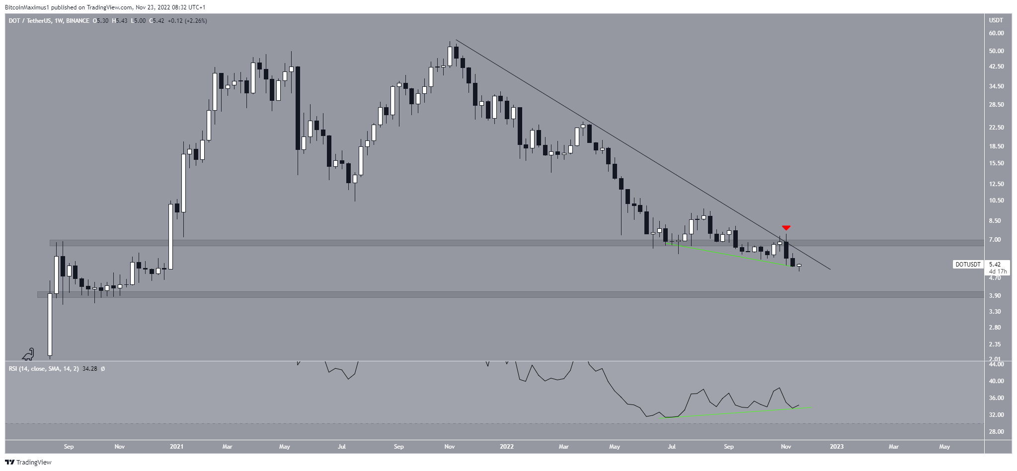 The resistance line of the wedge is at $6.80, coinciding with the long-term resistance area. Therefore, whether the price breaks out or gets rejected will likely determine the future DOT price prediction.