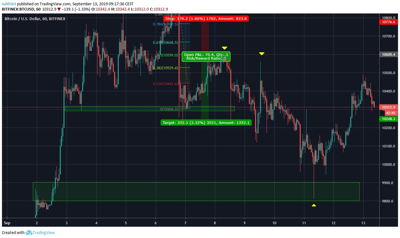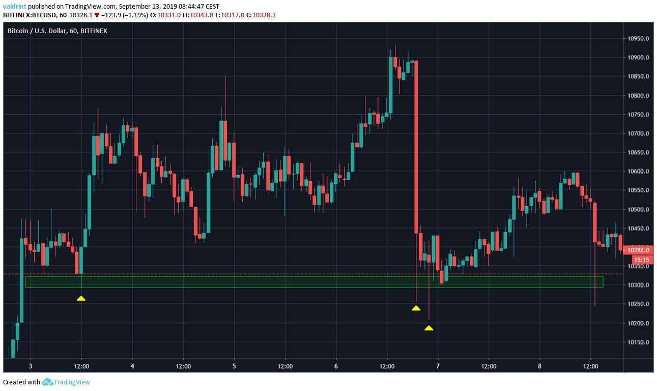 The price does not always react to every support area. However, the very long lower wicks on September 6 were an indication that it will react to the $10,300 area.