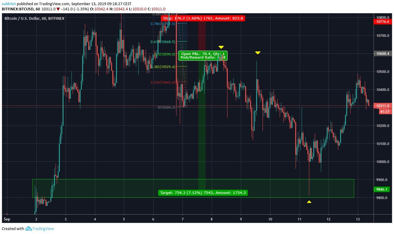 Sponsored SponsoredFor the sake of the analysis, keeping the original sell price of $10,600 with a target in the middle of the second support line at $9850 gives us a very good 4.5 risk:reward ratio.