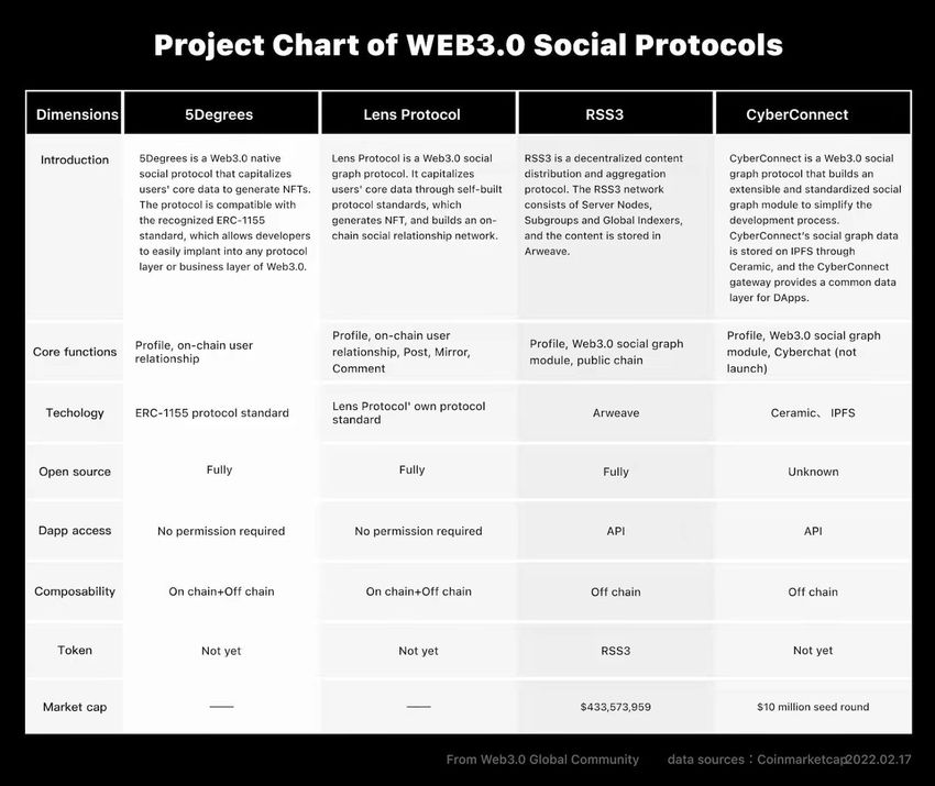 Among the famous players in Web3.0 social networking, Lens Protocol, RSS3, and CyberConnect have a similar focus with 5Degrees.