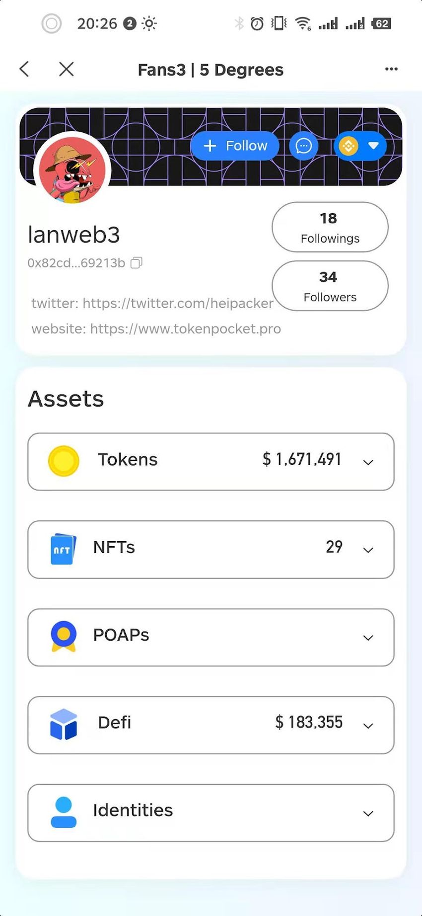 Currently, the personal information that Fans3 supports to display includes tokens, NFTs, POAPs (Proof of Attendance), DeFi (interactive DeFi applications and corresponding transaction volumes), and domain identities such as ENS, DAS, and RNS.