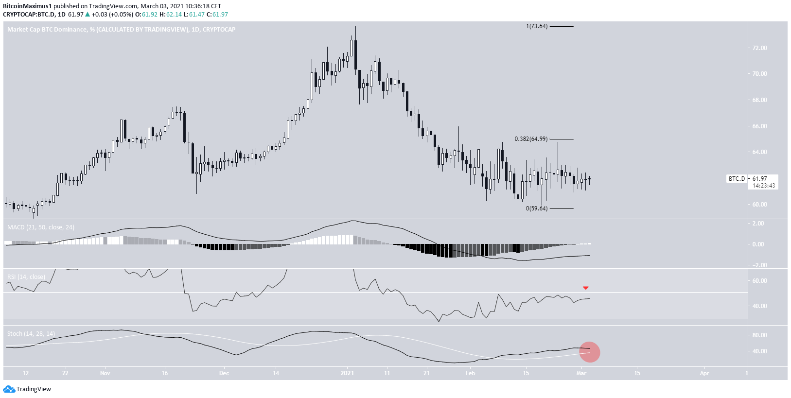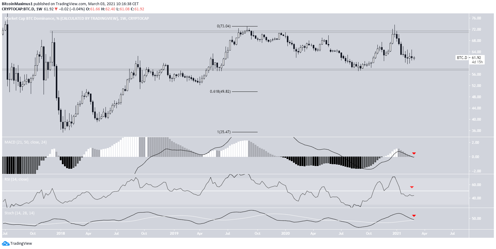 The BTCD has been moving downwards since reaching a local high of 73.63% in December 2020. The movement up to that point was a failed breakout attempt above the 71% resistance area. This is a resistance that has been in place since December 2017. The rejection left a long upper wick in its wake.