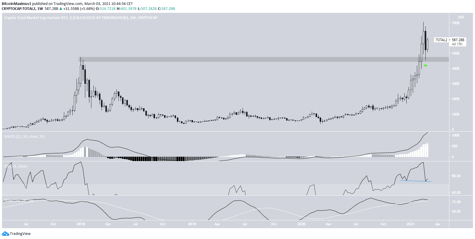 The altcoin market cap decreased considerably last week, creating a bearish engulfing candlestick. However, this only served to validate the previous all-time high area of $450 billion as support.