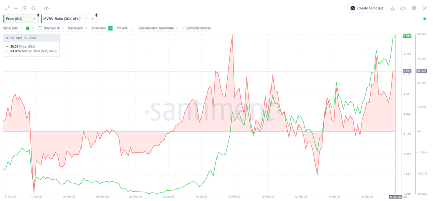 INJ continues its strong 2023 performance, hitting another year-to-date high of $6.30 on April 11. However, the Market Value to Realized Value data compiled by Santiment shows that INJ could experience a price correction. The MVRV determines potential buy/sell zones by comparing the average price at which an asset was acquired by its holders to its current market value.Â