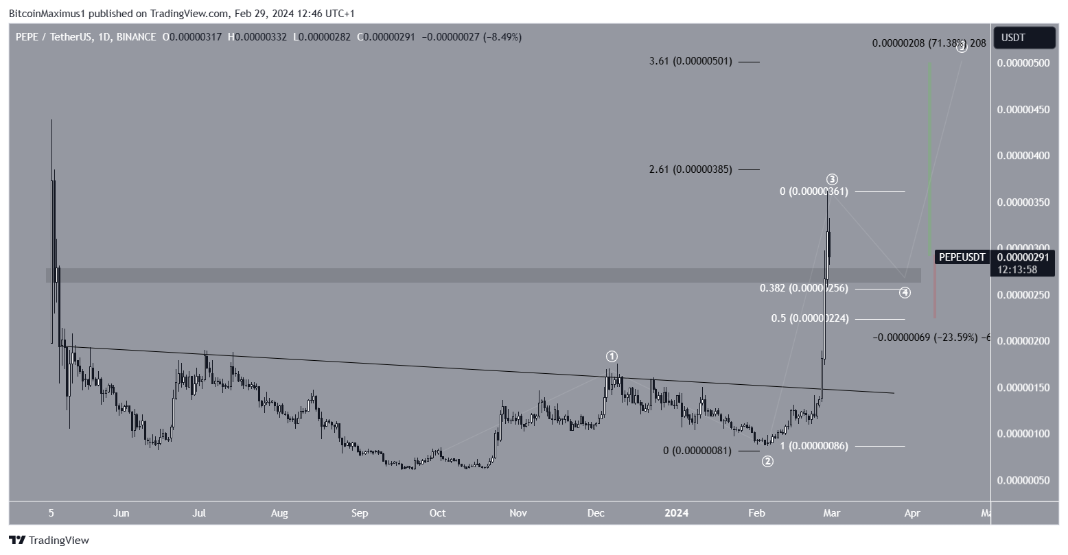 The most likely count suggests that PEPE is in wave three of a five-wave upward movement, having potentially started wave four. Wave three has nearly 2.61 times the length of wave one, a likely level for a local top.