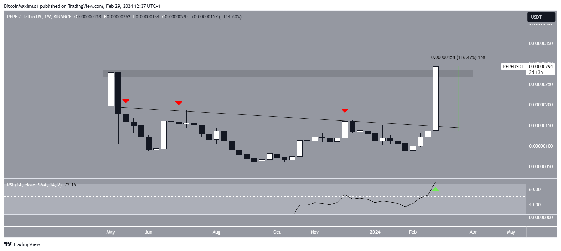 After starting an upward movement in February, the PEPE price finally broke out this week amidst a 116% weekly increase. PEPE reached a high of $0.00000368 before falling slightly. Despite the price drop, PEPE still trades above the final horizontal resistance area in the weekly time frame.